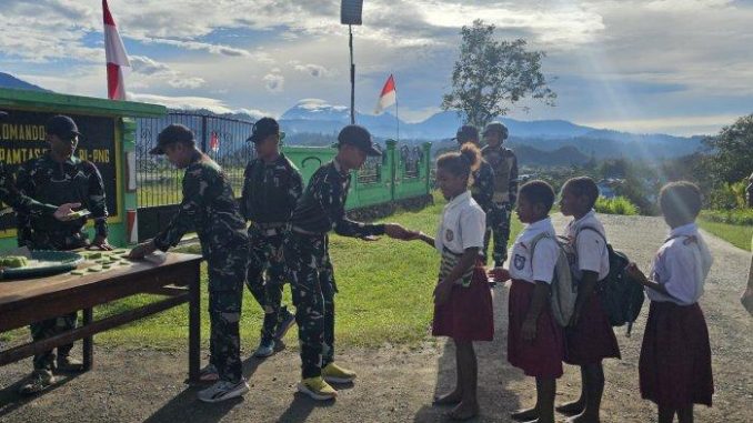 PAPUA, Penkogab3 – Jumat berkah, Satgas Yonif 512/QY terus berupaya menunjukkan kepeduliannya kepada masyarakat Papua dengan membagikan makanan gratis kepada anak-anak sekolah di wilayah Oksibil, Kabupaten Pegunungan Bintang, Provinsi Papua Pegunungan.