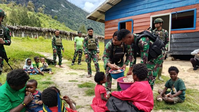 Mageabume Puncak, Penkogab3 – Satuan Tugas Batalyon Infanteri (Satgas Yonif) Raider 323/Buaya Putih Kostrad, salah satu Satuan Jajaran Komando Operasi HABEMA di Papua, tengah melaksanakan tugas Operasi Pengamanan Perbatasan Mobil RI-PNG, di wilayah Kabupaten Puncak, Provinsi Papua Tengah. Pada hari Senin, 30 Desember 2024, Satgas Yonif 323 Kostrad, khususnya Pos Pintu Jawa pimpinan Lettu Inf Caroko, mewujudkan kepedulian sosial melalui pemberian makan siang gratis kepada warga Kampung Gelegi, Distrik Mageabume.