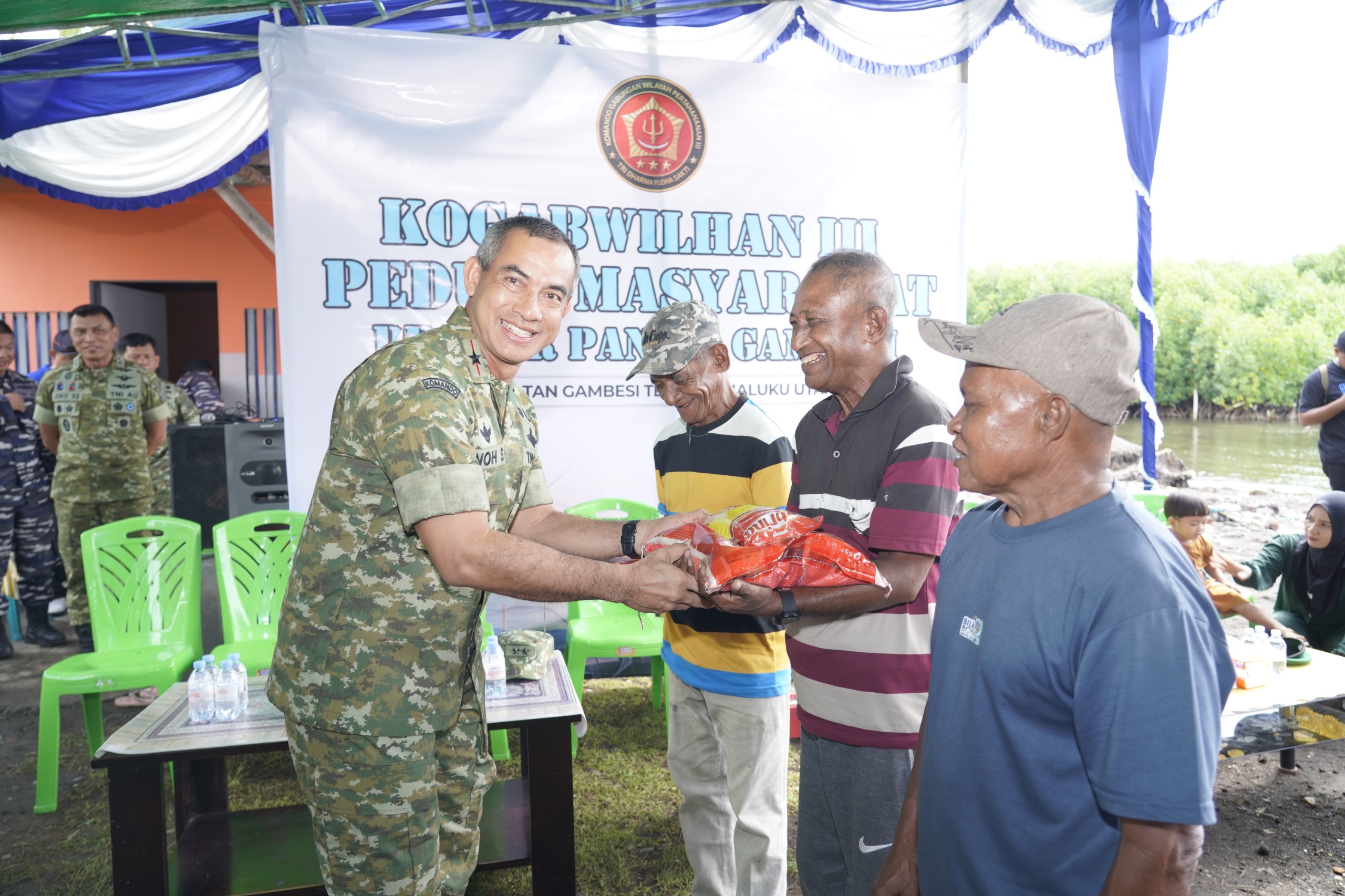 Mewakili Pangkogabwilhan III Letjen TNI Bambang Trisnohadi, Kaskogabwilhan III Marsekal Muda TNI Ir. Joko Sugeng Sriyanto, M.Sc., beserta rombongan hadir di kampung pesisir Desa Gambesi, menyampaikan salam hormat sekaligus pesan kebersamaan.