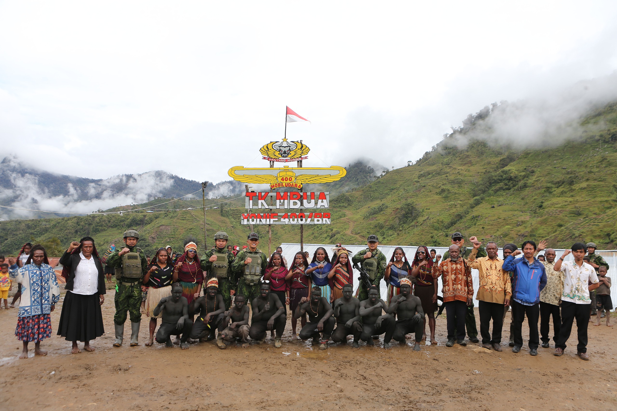 Kedatangan Pangkogabwilhan III bersama rombongan disambut hangat oleh Danpos TK Mbua Yonif 400/BR, para pendeta, tokoh masyarakat, serta tarian adat yang dibawakan penuh sukacita oleh warga.