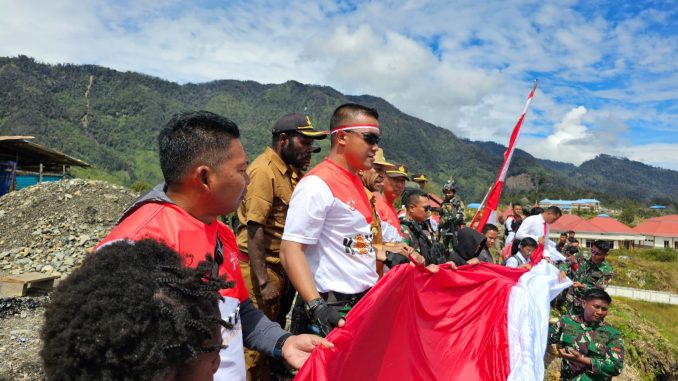Apolos Bagau, S.T., selaku Pj. Bupati Kabupaten Intan Jaya menyampaikan rasa bangga dan terima kasih atas upaya Satgas Yonif PR 330 yang telah menyelenggarakan kegiatan deklarasi Merah Putih dengan membentangkan bendera Merah Putih Raksasa.